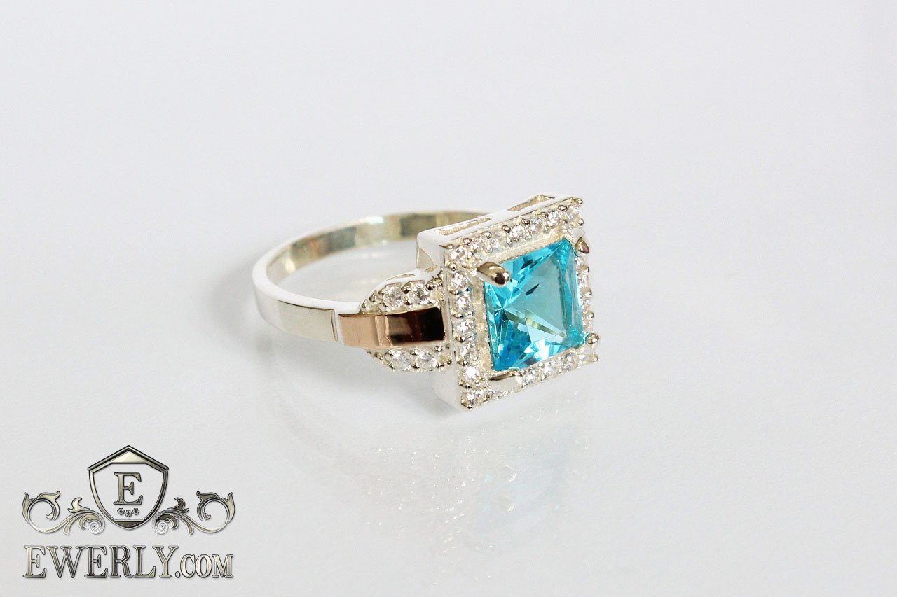 Женское кольцо из серебра с золотом и фианитом (светло-голубой цвет)